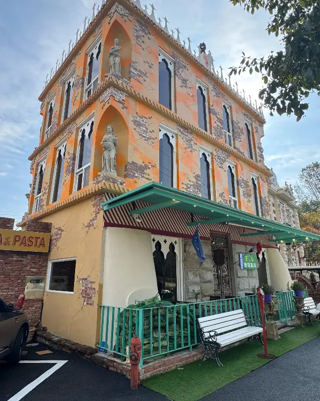 카페에 가까워질수록 웅장한 외관이 눈에 들어왔다. 마치 유럽의 고성을 그대로 옮겨놓은 듯한 모습이었다. 담쟁이덩굴이 벽면을 타고 올라가 운치를 더하고, 정문 기둥에는 섬세한 조각상이 세워져 있었다. 사진으로만 보던 풍경이 눈앞에 펼쳐지니, 마치 다른 세계에 온 듯한 기분이었다. 이런 멋진 공간이 익산에 숨어 있었다니!