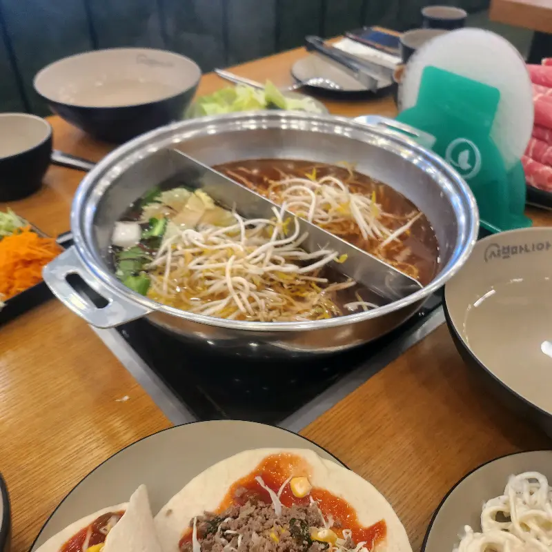 자리에 앉자마자 키오스크를 통해 주문을 했다. 메뉴는 다양했지만, 역시 샤브샤브가 가장 눈에 띄었다. 고기 종류와 육수를 선택할 수 있었는데, 우리는 반반 육수를 선택해 두 가지 맛을 모두 즐기기로 했다. 잠시 후, 샐러드바를 이용하라는 안내를 받았다. 기대감을 안고 샐러드바로 향했는데, 정말 다양한 종류의 신선한 야채들이 보기 좋게 진열되어 있었다. 배추, 청경채, 숙주, 버섯 등 샤브샤브에 빠질 수 없는 기본 야채들은 물론, 샐러드, 떡볶이, 파스타, 타코 등 다채로운 메뉴들이 준비되어 있어 눈이 휘둥그레졌다. ,