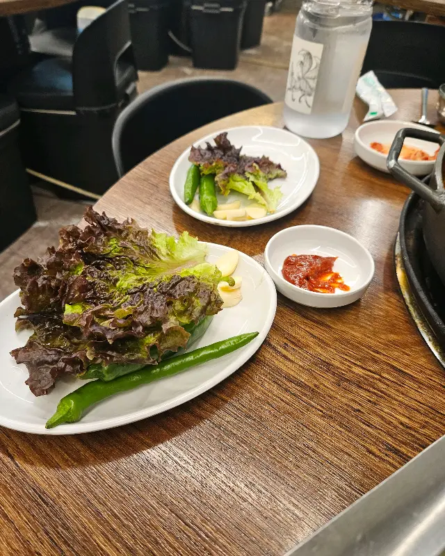 드디어 닭갈비가 완전히 익었다. 닭고기 한 점을 집어 입에 넣으니, 매콤하면서도 달콤한 양념이 입안 가득 퍼졌다. 닭고기는 잡내 없이 부드러웠고, 신선한 채소들은 아삭아삭 씹히는 식감이 좋았다. 특히 깻잎의 향긋한 향이 닭갈비의 풍미를 더욱 끌어올렸다. 쌈 채소에 닭갈비와 마늘, 쌈장을 올려 푸짐하게 쌈을 싸 먹으니, 정말 꿀맛이었다. 상추의 신선함과 닭갈비의 매콤함이 어우러져 입안에서 환상의 조합을 만들어냈다. 쌈을 싸 먹는 동안에도 직원분들은 계속해서 테이블을 살피며 부족한 반찬을 채워주셨다. 특히 상추를 많이 먹는 것을 보시고는, 말없이 상추를 더 가져다주시는 센스에 감동했다.