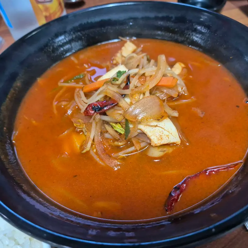 붉은 국물 위로 푸짐하게 올려진 숙주와 차돌박이가 시선을 사로잡았다. 향긋한 불향이 코를 간지럽혔고, 뜨거운 김이 올라오는 모습에 절로 침이 고였다. 숟가락으로 국물을 한 입 떠먹으니, 깊고 진한 맛이 입안 가득 퍼졌다. 얼큰하면서도 시원한 국물은 정말 최고였다. 특히, 숙주가 듬뿍 들어가 있어 아삭아삭 씹히는 식감이 좋았다. 면 대신 밥이 들어가 있어서 국물의 맛이 더욱 잘 느껴지는 듯했다.