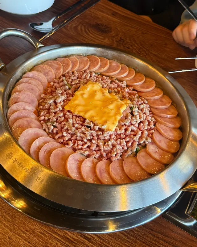 사이드 메뉴로 주문한 목살 소세지도 빼놓을 수 없다. 뜨겁게 달궈진 돌판 위에 구워져 나오는데, 돼지 목살과 소세지의 절묘한 조합이 정말 훌륭했다. 겉은 바삭하고 속은 촉촉한, 완벽한 겉바속촉이었다. 곁들여 나오는 신선한 쪽파와 함께 먹으니, 느끼함은 싹 가시고 향긋함이 입안 가득 퍼졌다. 부대찌개와 함께 곁들여 먹으니, 그 조화가 더욱 환상적이었다.