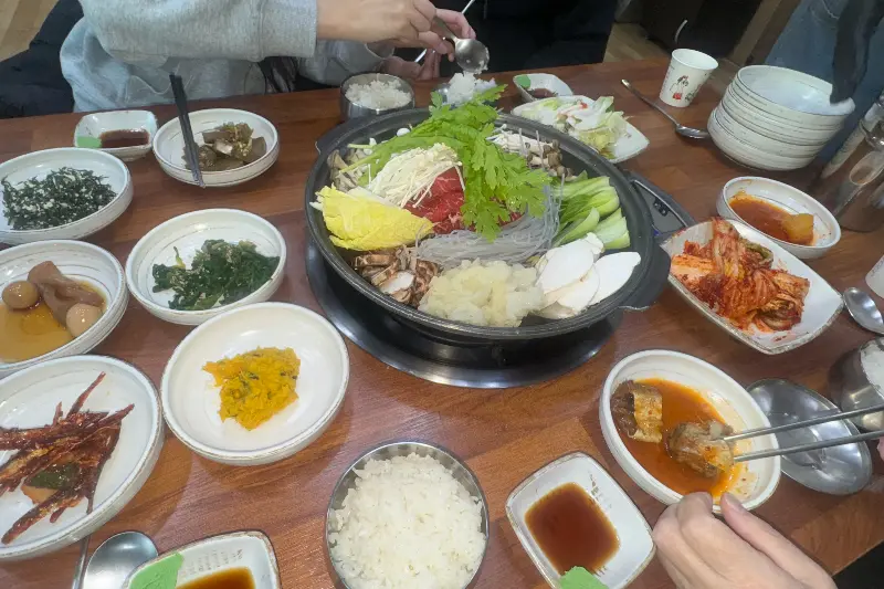 드디어 기다리고 기다리던 버섯불고기전골이 등장했다. 냄비 안에는 정말 다양한 종류의 버섯들이 가득 담겨 있었다. 새송이버섯, 팽이버섯, 느타리버섯, 표고버섯 등 이름도 다 알 수 없을 만큼 많은 버섯들이 색색깔의 자태를 뽐내고 있었다. 버섯 사이사이에는 얇게 썰린 소고기가 넉넉하게 들어 있었고, 육수의 맑은 빛깔은 건강한 맛을 예감하게 했다. 사진에서 보이듯이, 냄비가 터질 듯이 푸짐한 양은 보기만 해도 배가 불렀다.