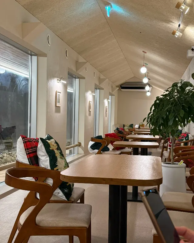 카페에 가까워질수록 주변 풍경은 더욱 한적해졌다. ‘이런 곳에 정말 카페가 있을까?’라는 의구심이 들 때 즈음, 넓은 주차장이 눈에 들어오면서 안도의 숨을 내쉬었다. 시골마을 끝자락에 자리 잡은 포스레는 마치 비밀 정원처럼 아늑하고 평화로운 분위기를 풍겼다. 문을 열고 들어서는 순간, 화이트 톤의 깔끔한 인테리어와 따뜻한 조명이 어우러져 편안한 느낌을 선사했다. 로비에 놓인 커다란 트리는 마치 크리스마스 시즌에 방문한 듯한 설렘을 안겨주었다.