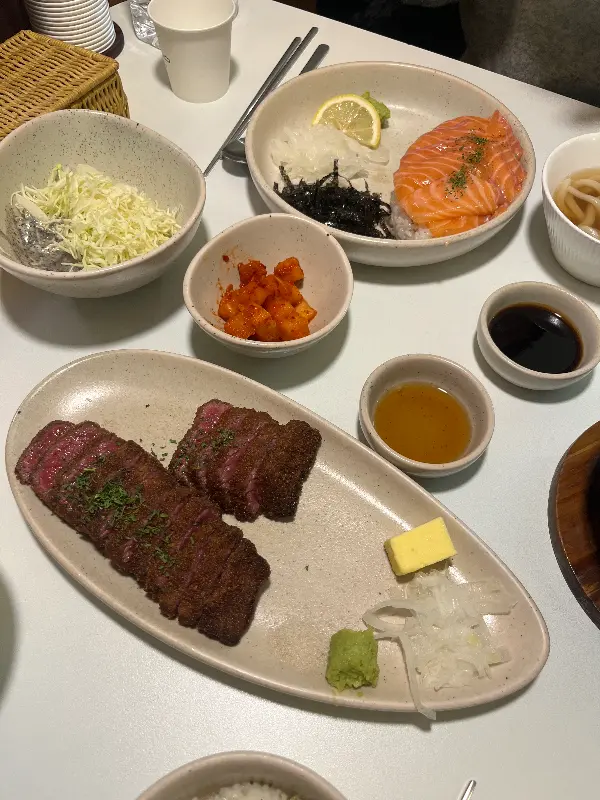 고민 끝에 규카츠 정식과 연어덮밥을 주문했다. 잠시 후, 테이블 위로 정갈하게 차려진 한 상이 펼쳐졌다. 겉은 바삭하고 속은 촉촉한 규카츠, 윤기가 흐르는 연어덮밥, 그리고 곁들여 먹을 수 있는 다양한 소스와 반찬들까지. 보기만 해도 군침이 돌았다.