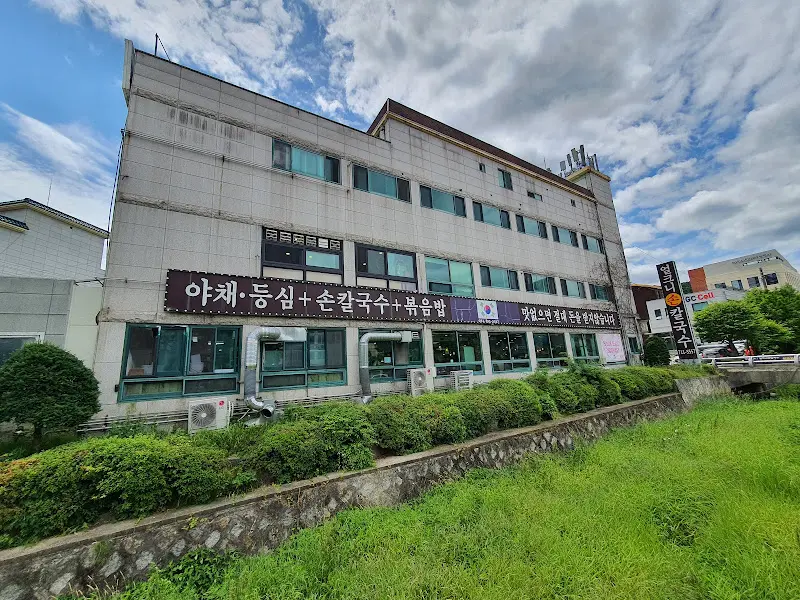 차를 몰아 도착한 곳은 꽤 큰 규모의 건물이었다. 건물 외벽에 큼지막하게 쓰여 있는 “야채+등심+손칼국수+볶음밥”이라는 문구가 시선을 사로잡았다. 마치 코스 요리처럼 다양한 음식을 한 번에 즐길 수 있다는 기대감이 샘솟았다. 넓은 주차 공간이 마련되어 있어 편하게 주차할 수 있었다.