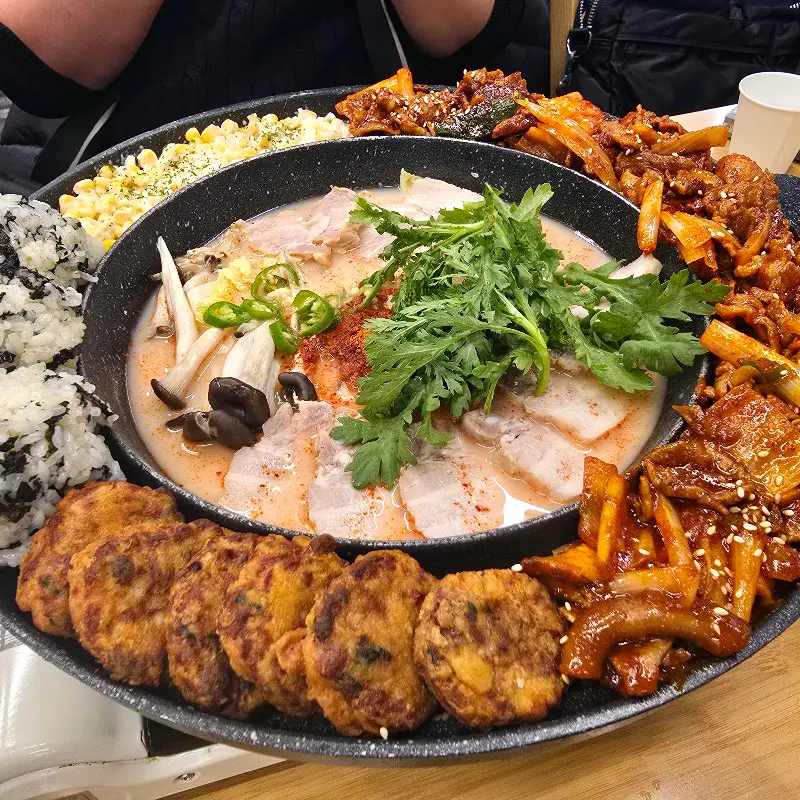 다음은 수육전골 차례였습니다. 뽀얀 국물에 큼지막한 수육과 신선한 채소가 듬뿍 들어간 모습이 보기만 해도 든든했습니다. 국물을 한 입 떠먹으니, 깊고 진한 맛이 온몸을 따뜻하게 감싸는 듯했습니다. 돼지 특유의 잡내는 전혀 느껴지지 않았고, 깔끔하면서도 시원한 맛이었습니다. 수육은 어찌나 부드러운지, 입에 넣자마자 사르르 녹아내렸습니다.