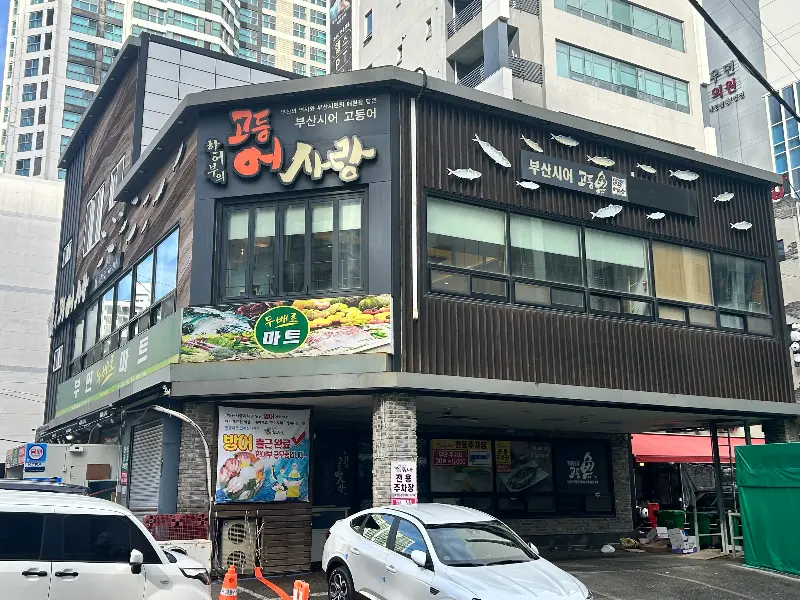건물 외관부터가 심상치 않았다. 2층 건물 전체를 사용하는 식당은 멀리서도 눈에 띄었다. 커다란 간판에는 큼지막한 글씨로 ‘고등어’와 ‘사랑’이라는 단어가 박혀 있었고, 그 옆에는 귀여운 물고기 그림들이 헤엄치고 있었다. 마치 “여기, 고등어에 진심인 사람, 나야 나!”라고 외치는 듯했다. 건물 벽면에는 ‘부산시 고등어 요리’라는 문구가 자랑스럽게 새겨져 있었다.