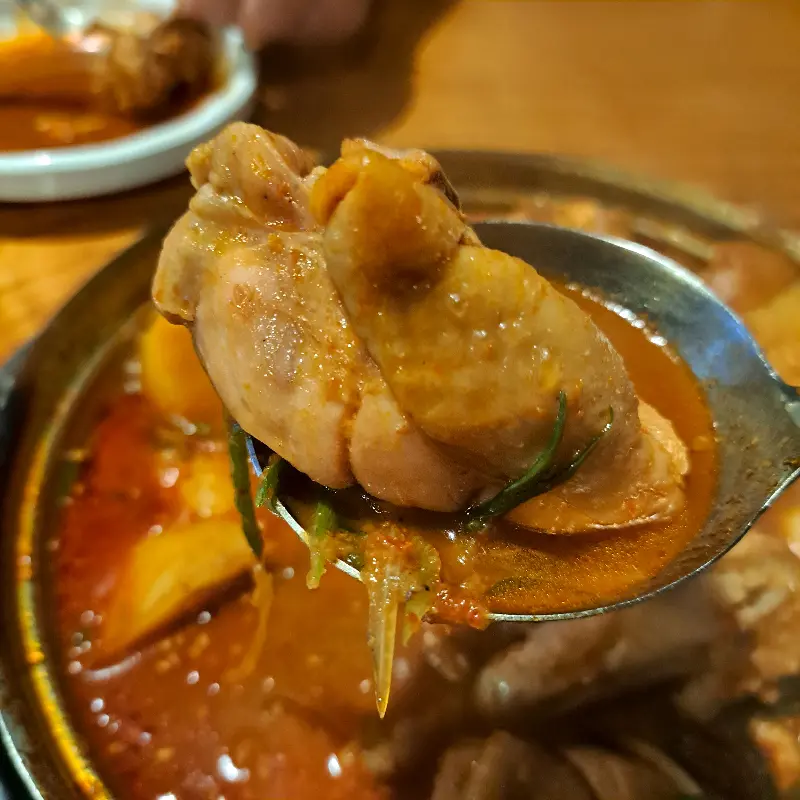 드디어 기다리고 기다리던 닭볶음탕이 등장했다. 큼지막한 냄비에 담긴 닭볶음탕은 보기만 해도 군침이 돌았다. 닭고기, 감자, 양파, 떡 등 푸짐한 재료들이 듬뿍 들어 있었고, 매콤한 양념 냄새가 코를 자극했다. 냄비 위에는 싱싱한 파채와 깨소금, 앙증맞은 메추리알이 올려져 있어 시각적인 즐거움까지 더했다. 참고)