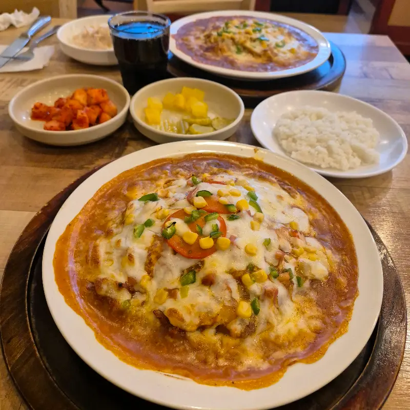 메인 메뉴인 피자 돈까스는 뜨겁게 달궈진 접시 위에 푸짐하게 담겨 나옵니다. 돈까스 위에 얹어진 피자 소스와 치즈는 환상적인 조화를 이루며, 한 입 베어 물면 입안 가득 퍼지는 풍부한 맛은 어린 시절의 기억을 되살리기에 충분합니다. 특히, 갓 구워져 나온 듯 따뜻한 돈까스는 바삭한 튀김옷과 부드러운 돼지고기의 조화가 일품입니다. 함께 제공되는 깍두기는 느끼함을 잡아주는 역할을 하며, 밥과 콜라는 든든한 한 끼 식사를 완성시켜 줍니다.