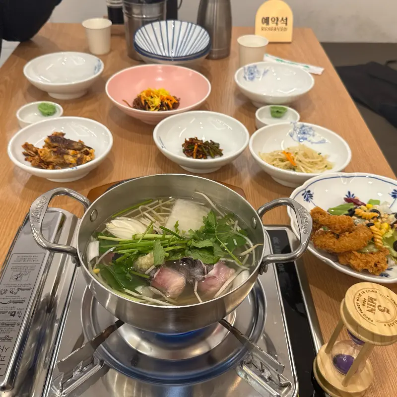 세트 메뉴에 포함된 아구탕도 빼놓을 수 없었다. 뚝배기에 담겨 나온 아구탕은 보기만 해도 속이 풀리는 듯한 비주얼을 자랑했다. 맑은 국물에 쑥갓, 대파 등 신선한 채소가 듬뿍 들어가 있어서, 향긋한 향이 코를 간지럽혔다. 국물을 한 입 떠먹으니, 시원하면서도 깊은 맛이 온몸을 감쌌다. 쌀쌀한 날씨에 얼었던 몸이 사르르 녹는 기분이었다. 아구 살도 부드럽고 담백해서, 밥과 함께 먹으니 든든했다.
