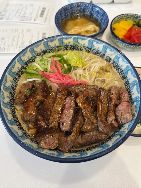 자리를 잡고 앉아 메뉴판을 펼쳐 들었다. 스테이크, 덮밥, 파스타, 라멘 등 다양한 메뉴들이 눈길을 끌었다. 특히 스테이크덮밥이 가장 인기가 많다고 하여, 부챗살 스테이크 덮밥을 주문했다. 왠지 오늘은 고기가 땡기는 날이었다. 잠시 후, 정갈하게 차려진 한 상이 내 앞에 놓였다.