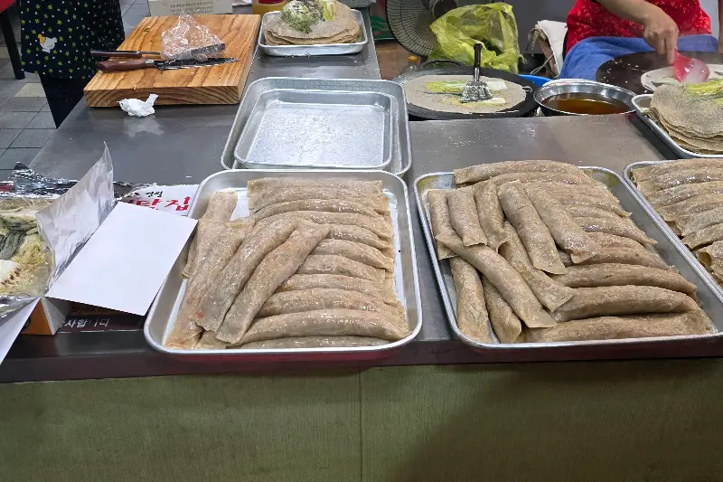 가게를 나와 다시 시장을 둘러봤다. 배가 불렀지만, 왠지 모르게 그냥 지나칠 수 없는 먹거리들이 가득했다. 갓 튀겨낸 닭강정의 달콤한 냄새, 김이 모락모락 나는 찐빵의 따뜻한 온기, 그리고 알록달록한 색깔의 강정까지. 하나하나 맛보고 싶었지만, 이미 배가 너무 불러 다음을 기약할 수밖에 없었다.