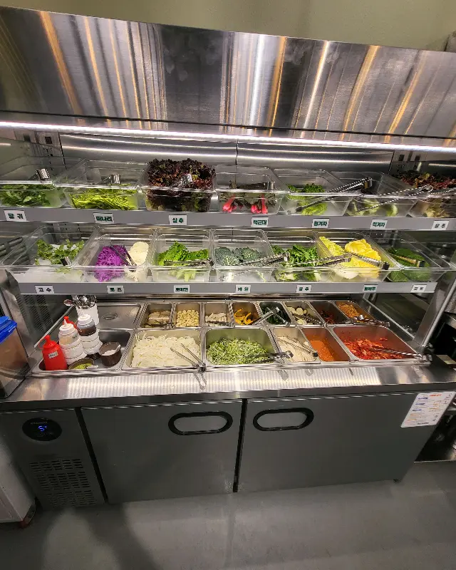 주문을 마치자, 직원분께서 친절하게 샐러드바 이용 방법을 안내해 주셨다. 샐러드바는 1인당 3천 원에 이용할 수 있는데, 각종 쌈 채소와 구워 먹을 수 있는 채소, 김치, 콩나물 등 다양한 종류의 반찬들이 무제한으로 제공된다고 했다. 샐러드바 코너로 향하는 발걸음이 저절로 빨라졌다.
