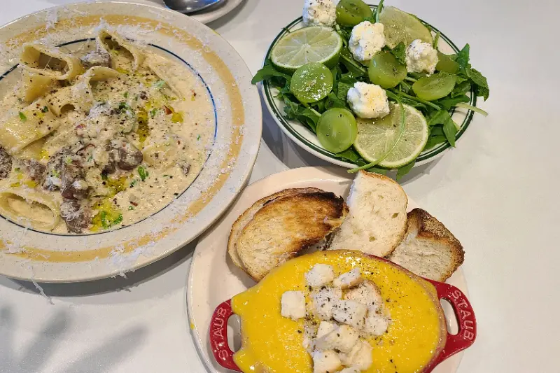 자리에 앉자마자 메뉴판을 정독했다. 파스타, 샐러드, 타코, 샌드위치 등 다양한 메뉴들이 눈길을 사로잡았다. 특히 ‘특별한 메뉴가 있어요’라는 키워드를 선택한 사람들의 후기가 많았던 만큼, 라코니만의 개성이 담긴 메뉴들에 대한 기대감이 컸다. 고민 끝에, 가장 인기 있다는 단호박 스프와 쉬림프 로제 파스타, 그리고 새롭게 출시되었다는 트러플 화덕 브레드를 주문했다.