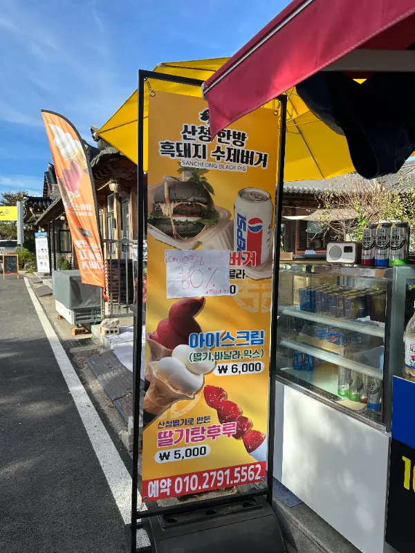 가게 입구에는 큼지막한 메뉴 배너가 세워져 있었다. 흑돼지 수제버거와 함께 아이스크림, 탕후루 사진이 먹음직스럽게 담겨 있었다. 특히 흑돼지 버거 옆에 쓰인 ‘산청 한방 흑돼지 수제버거’라는 문구가 호기심을 자극했다. 곧장 매장 안으로 들어섰다.