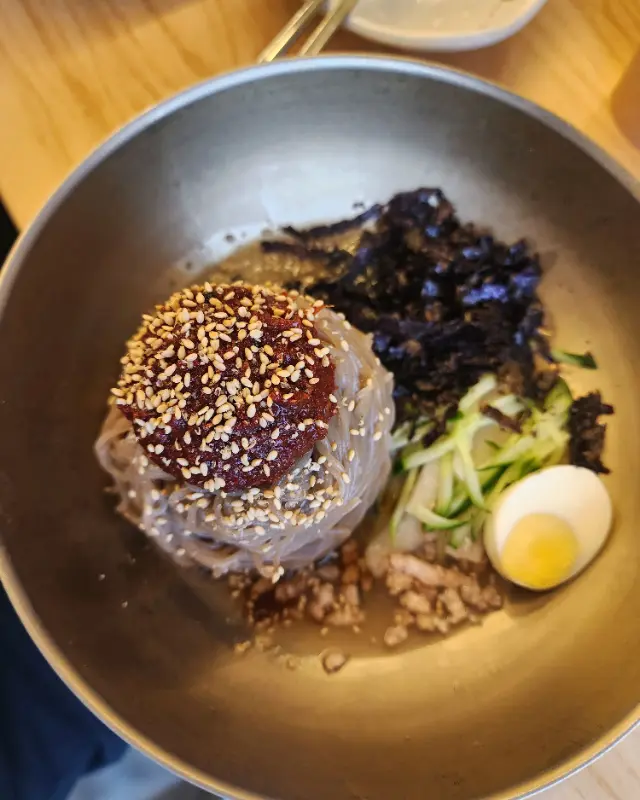 신래천 막국수의 가장 큰 매력은, 자가제면한 메밀면이었다. 직접 뽑은 면이라 그런지, 면 자체에 고소한 맛이 느껴졌다. 면발도 탱글탱글하고 쫄깃해서 식감이 정말 좋았다. 육수도 평범한 육수가 아니었다. 동치미 육수와 고기 육수를 황금 비율로 섞어, 시원하면서도 깊은 감칠맛을 냈다. 양념 역시 자극적이지 않고 깔끔해서 좋았다.