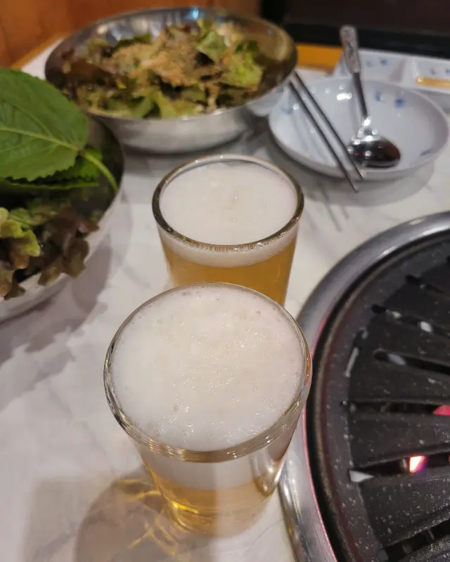 드디어 기다리고 기다리던 굴삼겹이 나왔다. 싱싱한 굴과 두툼한 삼겹살의 조합이라니, 보기만 해도 군침이 절로 넘어갔다. 연탄불 위에 삼겹살을 올리고, 그 주변으로 굴을 가지런히 놓았다. 뜨거운 불판 위에서 삼겹살은 지글지글 익어가고, 굴은 촉촉하게 수분을 머금었다. 삼겹살에서 흘러나온 기름이 굴에 스며들어 더욱 풍미를 더하는 듯했다.