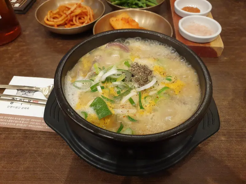 드디어 기다리고 기다리던 순대국이 나왔다. 뚝배기 안에서 보글보글 끓는 모습이 식욕을 자극했다. 국물은 뽀얀 빛깔을 띠고 있었고, 그 위에는 송송 썰린 파와 다진 양념이 얹어져 있었다. 코를 찌르는 구수한 냄새가 어릴 적 할머니 댁에서 먹던 순대국을 떠올리게 했다.