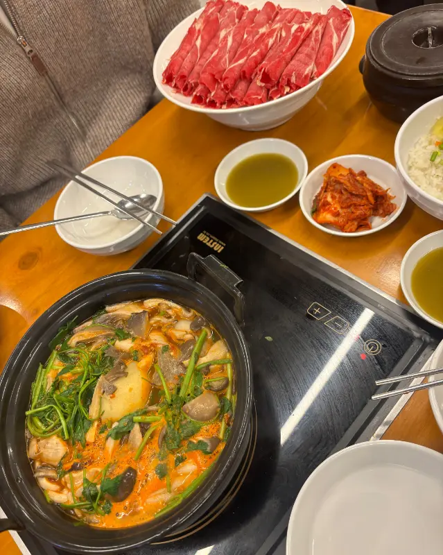 육수가 끓기 시작하자, 직원분께서 버섯과 채소를 먼저 넣어주셨다. 보글보글 끓는 육수 속에서 버섯과 채소가 익어가는 모습은 보기만 해도 군침이 돌았다. 국자로 국물을 떠 맛보니, 얼큰하면서도 시원한 맛이 일품이었다. 진하면서도 느끼하지 않은 국물 맛에 감탄사가 절로 나왔다.