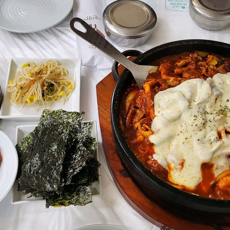 밑반찬을 하나씩 맛보는 사이, 드디어 기다리고 기다리던 돌판 오삼볶음이 등장했다. 뜨겁게 달궈진 돌판 위에서 오징어와 돼지고기가 붉은 양념에 버무려져 지글거리는 모습은 그야말로 압도적이었다. 큼지막하게 썰린 오징어와 돼지고기는 신선함이 눈으로도 느껴질 정도였다. 치즈 사리를 추가했더니, 볶음 위에 하얀 치즈가 듬뿍 덮여 있었다. 매콤한 볶음 양념과 고소한 치즈의 조합은 상상만으로도 황홀했다.