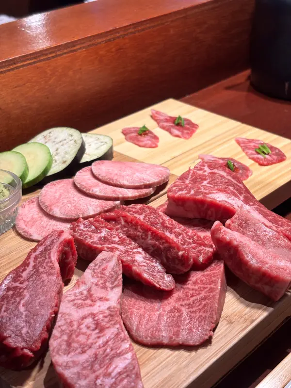 곧이어 우설과 한우 5종이 나왔다. 안심, 채끝, 치마살, 부채살, 업진살 등, 다양한 부위의 한우가 나무 도마 위에 보기 좋게 담겨 나왔다. 직원분께서는 각 부위별 특징과, 어떤 순서로 구워 먹는 것이 가장 맛있는지 상세하게 설명해주셨다. 마치 전문가의 설명을 듣는 듯한 느낌이었다. 고기의 마블링은 정말 예술적이었는데, 보기만 해도 입안에 침이 고였다. 곁들여 먹을 수 있는 가지구이와 애호박 구이, 그리고 두 종류의 와사비도 함께 나왔다. 특히 박으로 만든 짱아찌는 독특한 풍미를 자랑했다.