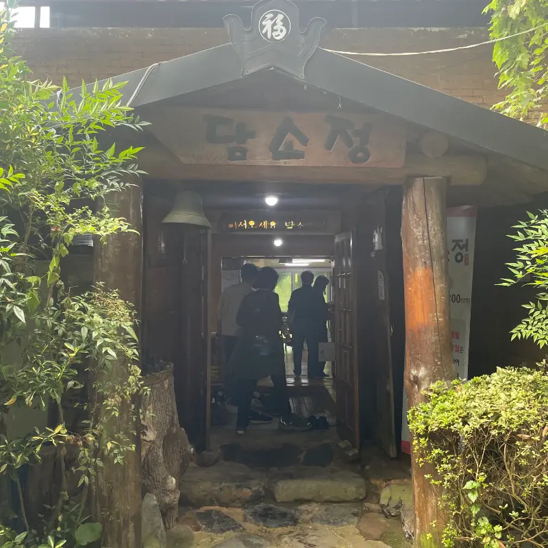 굽이굽이 길을 따라 들어가니, 과연 소문대로 아름다운 정원이 눈앞에 펼쳐졌다. 푸른 나무들이 햇살을 가려주는 덕분에 한낮의 뜨거운 기운도 잊을 수 있었다. 나무로 지어진 듯한 입구는 정갈하면서도 고풍스러운 느낌을 자아냈다. 입구에는 ‘담소정’이라는 나무 간판이 묵직하게 자리 잡고 있었고, 그 위에는 복(福)자가 새겨진 작은 장식이 눈에 띄었다. 마치 다른 세계로 들어가는 문 같았다.