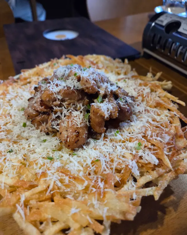 다음으로 나온 감자 닭전은, 얇게 채 썬 감자를 바삭하게 구워낸 전 위에, 간장 소스로 맛을 낸 닭고기를 얹은 메뉴였다. 겉은 바삭하고 속은 촉촉한 감자전과 짭짤하면서도 달콤한 닭고기의 조화가 훌륭했다. 특히, 함께 제공되는 치폴레 소스를 찍어 먹으니, 매콤한 맛이 더해져 느끼함을 잡아주었다. 감자 닭전은 남녀노소 누구나 좋아할 만한 맛이었다.
