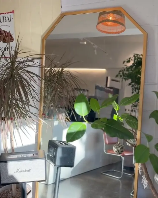 문을 열자 은은한 커피 향과 함께 따뜻한 온기가 느껴졌다. 평일 낮 시간이라 그런지, 카페는 비교적 한산하고 조용한 분위기였다. 한쪽 벽면을 가득 채운 커다란 거울이 눈에 띄었다. 단순한 거울이 아니라, 카페 내부를 더욱 넓고 시원하게 보이게 하는 인테리어 소품이었다. 마샬 스피커에서 흘러나오는 잔잔한 음악소리가 공간을 부드럽게 감쌌다. 식물들도 곳곳에 놓여 있어 편안함을 더했다.