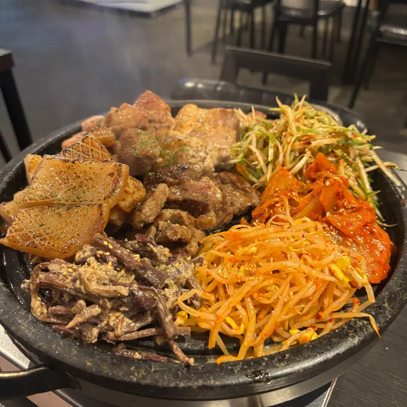 주문을 마치자, 직원분께서 능숙한 솜씨로 돌판 위에 고기를 올려주셨다. 놀라웠던 점은, 고기가 이미 다 구워져서 나온다는 것이었다. 덕분에 옷에 냄새가 밸 걱정 없이 편안하게 식사를 즐길 수 있었다. 지글지글 익어가는 고기를 바라보며 침을 꼴깍 삼키는 동안, 맛있는 냄새가 더욱 강렬하게 코를 찔렀다.