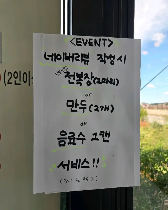 식사를 마치고 계산을 하려고 카운터로 갔는데, 사장님께서 정말 친절하게 맞아주셨다. 음식 맛은 물론이고, 친절한 서비스까지 더해지니 정말 기분 좋게 식사를 마칠 수 있었다. 계산대 옆에는 리뷰 작성 이벤트 안내문이 붙어 있었다. 네이버 리뷰를 작성하면 전복장, 만두, 음료 중 하나를 서비스로 제공한다고 한다. 이런 혜택까지 챙길 수 있다니, 정말 만족스러웠다.