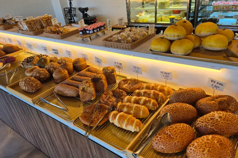 문을 열고 들어서자, 고소한 빵 냄새가 코를 간지럽혔다. 진열대에는 갓 구워져 나온 듯한 빵들이 가득했는데, 그 종류가 정말 어마어마했다. 클래식한 소금빵부터 바게트, 치아바타는 물론이고, 달콤한 크림빵, 몽블랑, 카스테라, 케이크까지. 빵지순례를 온 빵순이의 눈이 휘둥그레질 수밖에 없는 광경이었다. 쟁반과 집게를 들고 천천히 빵들을 둘러보기 시작했다.
