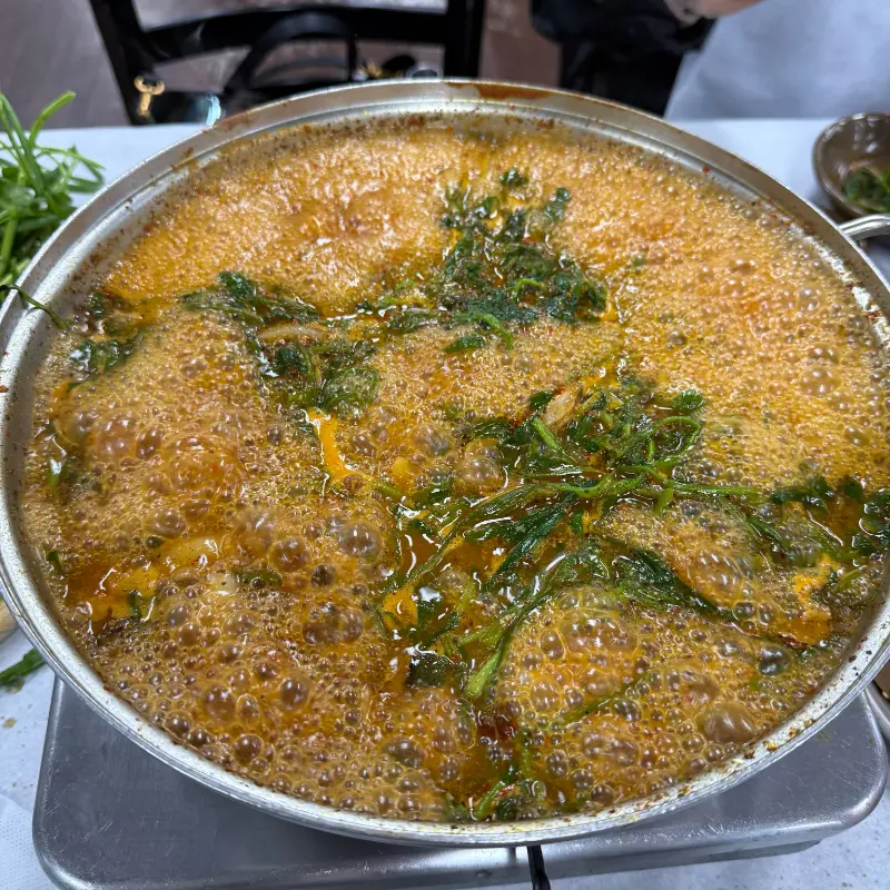 가장 먼저 눈에 띈 건 역시나 냄비 가득 담긴 오리전골이었다. 진한 색깔의 국물 위로 싱싱한 미나리와 부추가 산처럼 쌓여 있었다. 마치 샤브샤브처럼, 숨이 살짝 죽으면 국물에 적셔 먹는 방식이라고 했다. 맑고 청량한 녹색 채소들과 붉은 빛이 감도는 육수의 조화가 시각적으로도 엄청난 식욕을 자극했다.