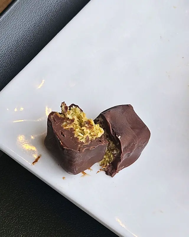 다음으로 두바이 초콜릿을 맛보았다. 겉은 바삭한 카다이프로 덮여 있고, 안에는 피스타치오 스프레드가 가득 들어있다고 한다. 한 입 베어 무니, 와작하는 소리와 함께 고소한 피스타치오 향이 입안을 가득 채웠다. 겉의 카다이프는 바삭하면서도 고소했고, 안의 피스타치오 스프레드는 부드럽고 달콤했다. 댓잎 아망드와는 또 다른 매력의 초콜릿이었다.