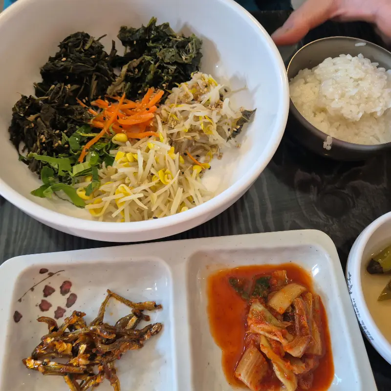 주문 후, 얼마 지나지 않아 정갈한 밑반찬들이 먼저 나왔다. 콩나물국, 김치, 멸치볶음 등 소박하지만 정성이 느껴지는 반찬들이었다. 특히 콩나물국은 시원하고 깔끔한 맛이 일품이었는데, 메인 메뉴가 나오기 전 입맛을 돋우기에 충분했다. 잠시 후, 드디어 기다리고 기다리던 약초 비빔밥이 나왔다. 커다란 그릇에 형형색색의 나물들이 보기 좋게 담겨 있었고, 밥 위에는 쌉쌀한 씀바귀가 얹어져 있었다. 젓가락으로 살살 비벼 한 입 맛보니, 입안 가득 퍼지는 약초의 향긋함과 쌉쌀함이 정말 훌륭했다.