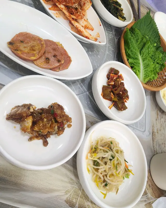 드디어 기다리고 기다리던 매운돼지갈비찜이 등장했다. 커다란 냄비 안에는 큼지막한 돼지갈비와 떡, 야채, 그리고 푸짐한 당면 사리가 가득 담겨 있었다. 매콤한 향이 코를 자극했고, 붉은 색감은 식욕을 더욱 돋우었다. 사진으로 봤던 것보다 훨씬 더 푸짐한 양에 감탄했다. 보글보글 끓는 갈비찜을 보니, 왜 이곳이 오랫동안 사랑받는 맛집인지 알 것 같았다.