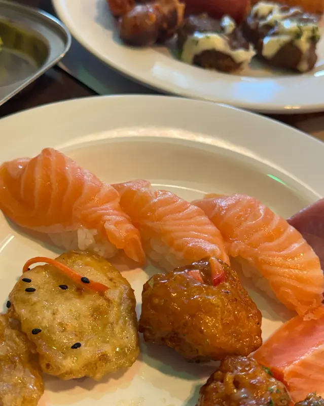 자리를 잡고 본격적으로 뷔페 탐험에 나섰다. 가장 먼저 눈에 들어온 것은 역시 스시 코너였다. 싱싱한 연어, 광어, 새우 등 다양한 종류의 스시가 보기 좋게 진열되어 있었다. 뷔페에 오면 꼭 먹어야 하는 연어초밥부터 공략하기 시작했다. 윤기가 자르르 흐르는 연어의 모습은 정말이지 먹음직스러웠다.