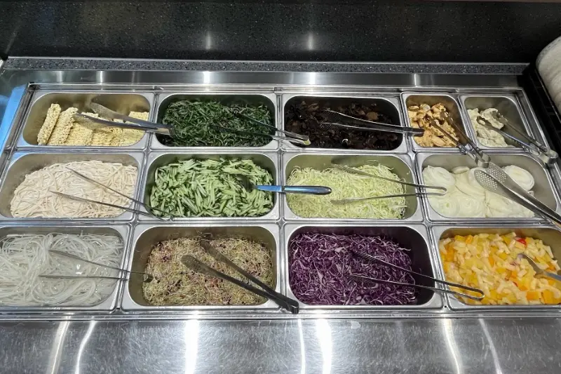 샐러드바는 정말 푸짐했다. 샤브샤브에 넣어 먹을 수 있는 다양한 종류의 야채는 물론, 월남쌈 재료, 닭강정, 떡볶이, 볶음밥, 탕수육, 호박죽 등 다채로운 메뉴들이 보기 좋게 진열되어 있었다. 야채 코너에는 신선한 배추, 청경채, 숙주, 버섯 등이 가득했고, 월남쌈 코너에는 새싹, 양배추, 적양배추, 오이, 깻잎 등 다채로운 채소들이 준비되어 있었다. 특히 마음에 들었던 점은, 모든 재료들이 신선하고 깔끔하게 관리되고 있다는 점이었다.