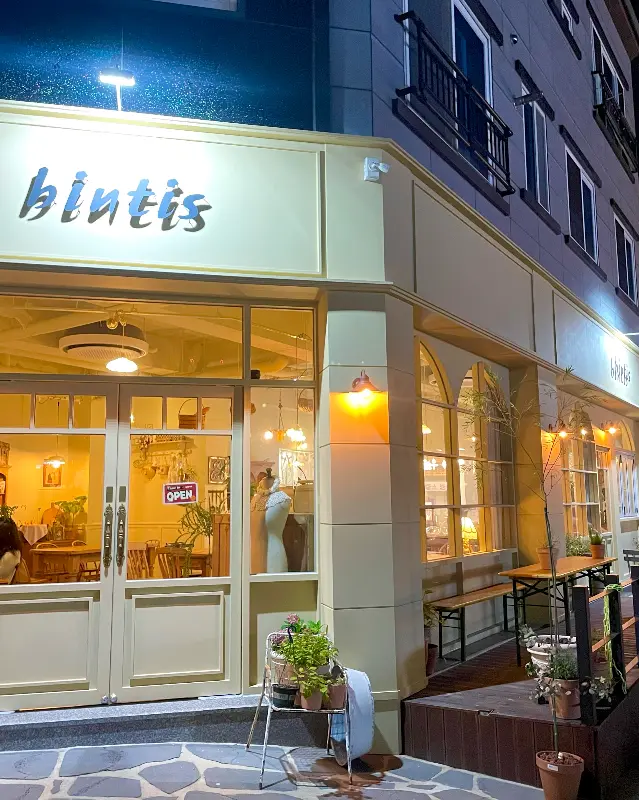 카페로 향하는 발걸음은 기대감으로 가득 찼다. 웅천 거리를 걷는 동안에도 마음은 이미 저 멀리 유럽의 어느 골목길을 헤매고 있었다. 드디어 눈 앞에 나타난 빈티스는 사진으로 보던 것보다 훨씬 더 매력적인 모습이었다. 따뜻한 크림색 외벽에 ‘bintis’라는 간판이 정갈하게 걸려 있었고, 통유리 너머로 은은한 조명이 새어나오는 모습이 마치 동화 속에서 튀어나온 듯했다.