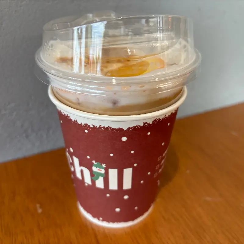 드디어 오렌지 커피가 나왔다. 투명한 컵 안에는 커피와 우유, 그리고 꿀에 절인 듯한 오렌지 조각들이 층층이 쌓여 있었다. 마치 작은 예술 작품을 보는 듯한 기분이었다. 사진에서 보이는 것처럼 컵 주변에는 크리스마스 분위기를 내는 빨간색 패턴이 둘러져 있어, 보기만 해도 기분이 좋아졌다. 첫 모금을 마시는 순간, 입 안 가득 퍼지는 오렌지 향이 정말 인상적이었다. 커피의 쌉쌀함과 오렌지의 달콤함이 절묘하게 조화를 이루면서, 전에 맛보지 못했던 특별한 풍미를 선사했다. 다만, 어떤 사람들은 오렌지 특유의 상큼함보다는 쿰쿰한 맛이 느껴진다고 할 수도 있겠다는 생각이 들었다. 하지만 나는 그 쿰쿰함마저도 좋았다. 그것은 아마도, 바쁜 일상에서 벗어나 잠시나마 나만의 시간을 즐기는 여유로움 때문이었을지도 모른다.