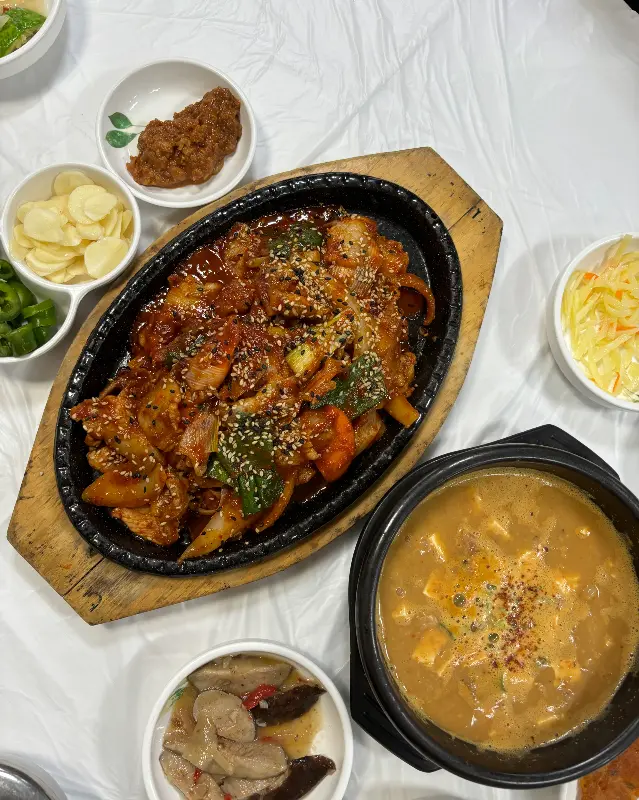 따뜻한 온기가 감도는 공간 안에는 이미 식사를 즐기고 있는 사람들로 북적였다. 테이블마다 놓인 음식들을 보니 하나같이 푸짐하고 맛있어 보였다. 특히 눈길을 사로잡는 건 단연 제육볶음이었다. 윤기가 자르르 흐르는 빨간 양념에 버무려진 제육볶음은 보기만 해도 입안에 침이 고이게 했다.
