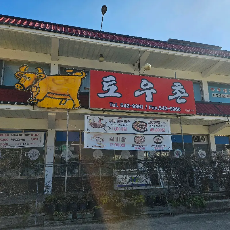 멀리서부터 눈에 띄는 커다란 간판. 붉은색 바탕에 큼지막하게 쓰인 ‘토우촌’이라는 글자와, 그 옆을 지키는 듯한 익살스러운 황소 그림이 정겹게 느껴졌다. 간판 아래에는 수제 돈까스와 김치찌개, 갈비탕 메뉴를 알리는 배너가 걸려 있었다. 전화번호와 팩스 번호가 함께 적혀 있는 것으로 보아, 꽤 오랫동안 이 자리를 지켜온 곳임을 짐작할 수 있었다.