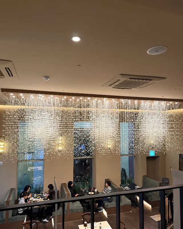 레스토랑에 들어서자마자 화려한 샹들리에와 은은한 조명이 눈에 들어왔습니다. 천장에서 쏟아지는 듯한 크리스탈 장식은 마치 별들이 쏟아지는 듯한 환상적인 분위기를 연출했습니다. 전체적으로 차분하면서도 세련된 인테리어는 데이트를 즐기기에 더할 나위 없이 완벽했습니다. 와인병으로 가득 찬 진열장을 보니, 이곳이 와인에 얼마나 진심인지 알 수 있었습니다.