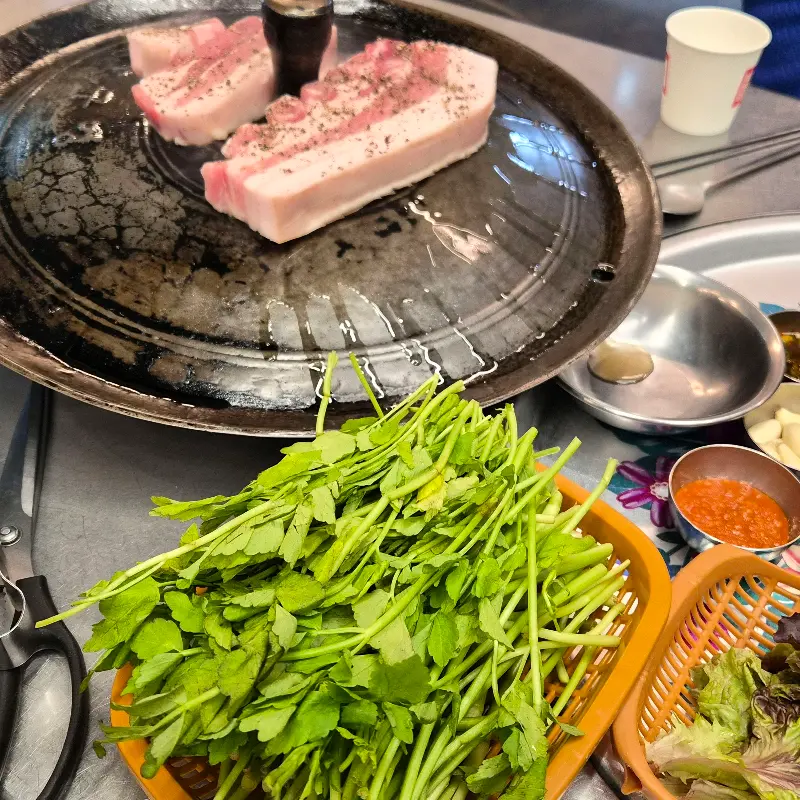 주문이 끝나기가 무섭게 밑반찬들이 테이블 위를 가득 채웠다. 콩나물무침, 파채, 갓김치, 깻잎 장아찌 등 하나하나 정갈하게 담겨 나온 반찬들은 보기만 해도 입맛을 돋우었다. 특히 눈에 띄는 것은 싱싱한 쌈 채소와 넉넉하게 담아져 나온 미나리였다. 향긋한 미나리는 삼겹살과 환상적인 궁합을 자랑한다고 하니 더욱 기대가 되었다. 사진에서 보듯이, 반찬 하나하나에도 정성이 가득 담겨 있는 듯했다.