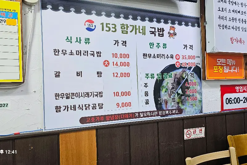 자리를 잡고 앉아 메뉴판을 훑어봤다. 한우소머리국밥, 갈비탕, 곰탕 등 다양한 메뉴들이 있었지만, 나의 선택은 단연 한우소머리국밥이었다. 100% 한우 소머리뼈로 우려낸다는 문구가 나의 기대를 한껏 끌어올렸다.