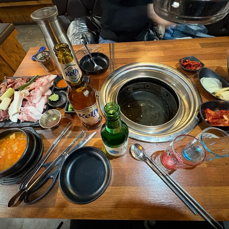 가게 문을 열자 활기찬 기운이 온몸을 감쌌다. 평일 저녁 시간이었는데도 테이블은 손님들로 북적였다. 다행히 웨이팅 없이 바로 자리에 앉을 수 있었다. 나무 테이블 위에는 동그란 환풍구와 불판이 놓여 있었고, 곧이어 밑반찬들이 차려졌다.