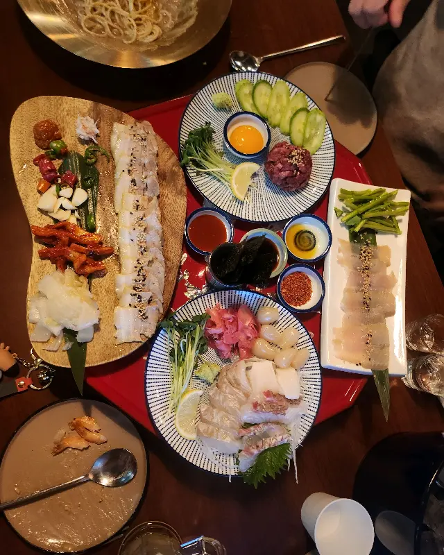가장 먼저 눈에 띈 것은 숙성회였다. 광어, 연어, 도미 등 다양한 종류의 숙성회가 신선한 해초, 곁들임 야채와 함께 플레이팅 되어 있었다. 윤기가 자르르 흐르는 숙성회 한 점을 집어 입에 넣으니, 입안 가득 퍼지는 풍미가 환상적이었다. 특히 숙성회 특유의 쫄깃한 식감과 감칠맛은 신선한 재료를 사용했다는 것을 단번에 알 수 있게 했다. 함께 나온 해초와 곁들여 먹으니 바다 내음이 더해져 더욱 풍성한 맛을 느낄 수 있었다.