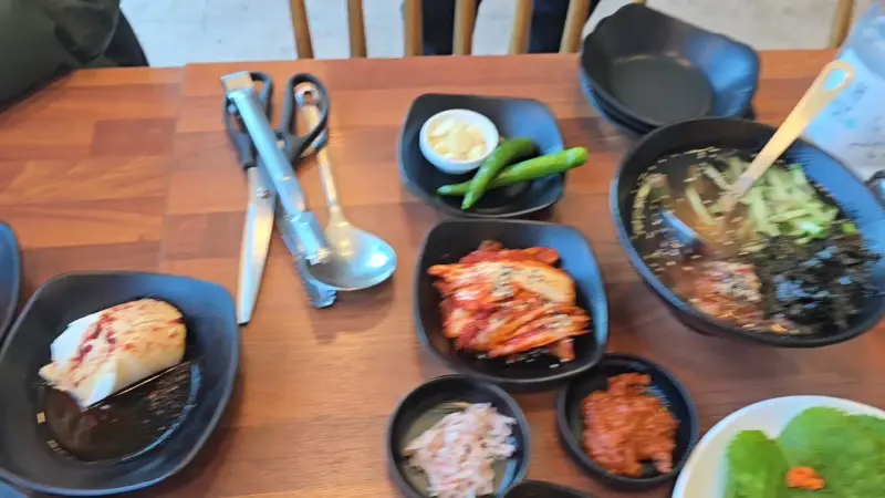 자리를 잡고 메뉴판을 펼쳐 들었다. 고민할 필요도 없이 대표 메뉴인 낙지보쌈피자 세트를 주문했다. 매운맛을 조절할 수 있다는 점도 마음에 들었다. 나는 매운 음식을 즐기지만, 너무 과한 매운맛은 피하고 싶었기에 보통맛으로 선택했다. 잠시 후, 테이블 위로 정갈하게 차려진 밑반찬들이 시선을 사로잡았다. 과하지 않으면서도 메인 메뉴와 잘 어울리는 구성이었다. 특히, 따뜻한 묵사발은 매콤한 낙지볶음과 환상의 궁합을 자랑했다.