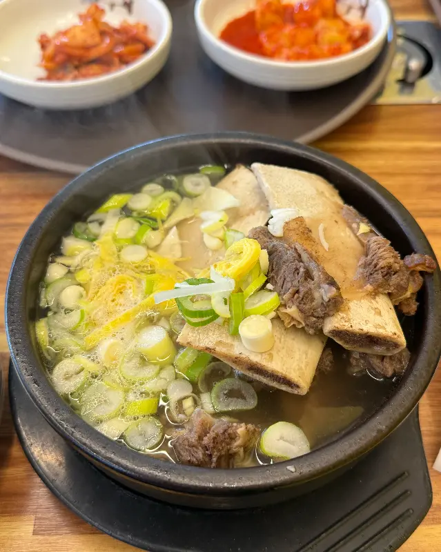 가게 문을 열자 따뜻한 기운이 온몸을 감쌌다. 테이블 사이 간격이 넓어 편안하게 식사를 즐길 수 있는 분위기였다. 노란 조명이 은은하게 빛나는 벽면에는 곰탕과 갈비탕 사진이 걸려 있어 식욕을 자극했다. 혼자 온 손님들을 위한 자리도 마련되어 있어 부담 없이 혼밥을 즐기기에도 좋아 보였다. 마침 창가 쪽 자리가 비어 있어 냉큼 자리를 잡았다.