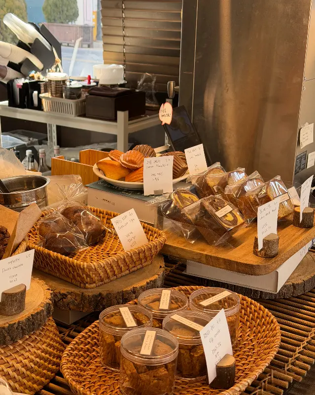 카페 문을 열자, 은은하게 퍼지는 구움 과자 향이 코를 간지럽혔다. 마치 비밀 정원에 들어선 듯, 아기자기한 소품들이 따뜻한 조명 아래 반짝이고 있었다. 진열대에는 마들렌, 휘낭시에, 쿠키 등 정성스럽게 포장된 디저트들이 저마다의 매력을 뽐내고 있었다. 보기만 해도 기분이 좋아지는 비주얼이었다. 쟁반 위에 정갈하게 놓인 디저트들을 보고 있자니, 마치 보물이라도 발견한 듯 마음이 설렜다.
