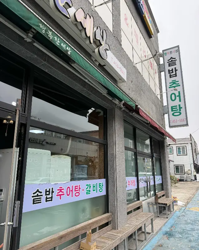 솔밭추어탕에 도착하니, 깔끔한 외관이 눈에 띄었다. 통유리창 너머로 보이는 넓고 쾌적한 내부가 인상적이었다. 가게 앞에 놓인 벤치에는 잠시 기다리는 손님들을 위한 배려가 엿보였다. ‘솔밭추어탕·갈비탕’이라고 적힌 간판이 정겹게 느껴졌다.